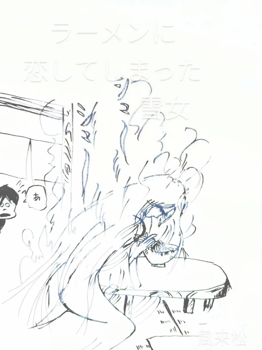描いたのは、『銀河鉄道999』の『アンドロメダの雪女』。鉄郎は、停車駅スノーインカで宇宙一美味しいラーメン屋のオヤジと、彼が想いをよせるユキと知り合う。機械の体となったユキだが、温かいラーメンを食べ溶けてしまった...。「次の停車駅は〜...虹の帯の星〜、虹の帯の星〜...。」