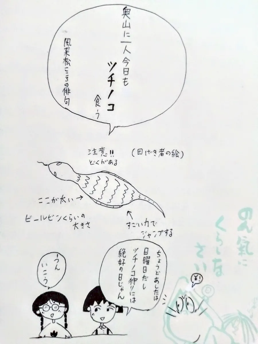 描いたのは1989年『ちびまる子ちゃん』の、『まぼろしのツチノコ株式会社』より。まる子たちは、あと一歩のところで捕獲に失敗したのであった…。