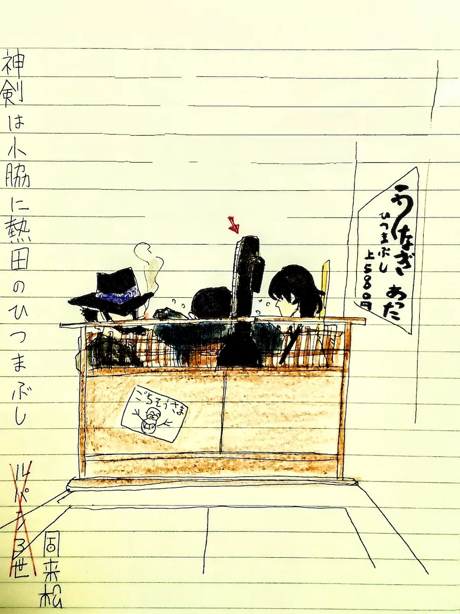 さて、絵に描いたのは、かつて新羅人・道行が使用し何百年もの間、開かずの門とされた〈清雪門〉を通り、天叢雲剣をまんまと盗み出したルパン三世一味が、熱田神宮前の老舗〈蓬莱軒〉で、ひつまぶしをかきこんでいるところ。獲物はギターケースの中。