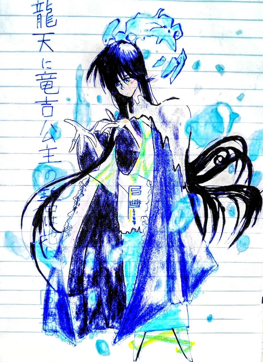 絵に描いたのは、マンガ『封神演義』の竜吉公主。昊天上帝と西王母を両親に持つスーパーサラブレッド! 蟠桃会で決まりを破った為、天から蓬莱山に堕とされ、その後〈殷周革命〉で太公望らと周に加勢し蘇妲己らと戦う。洪錦と結婚し〈方仙陣の戦い〉にて戦死。宝貝は、四界瓶、霧露乾坤網、二竜剣...等。