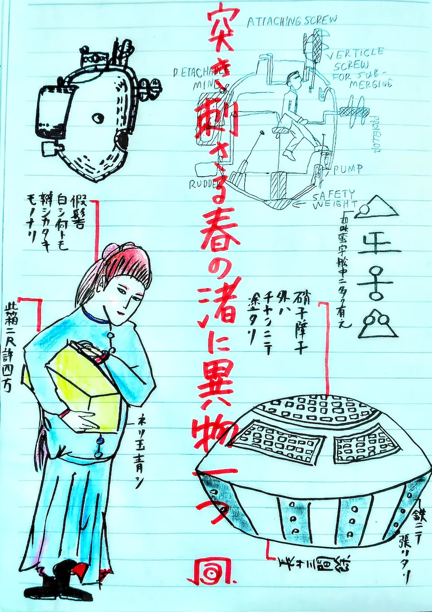 実は1775年、アメリカの発明化デビット・ダッシュネルが世界初の潜水艦〈タートル〉を発明(絵の上に描いたものがそれ)。ワシントンが資金援助し、ベンジャミン・フランクリンも協力して完成した! 人力駆動、世界初のスクリュー、6つのガラス窓が付いていた。これが、日本に流れ着いたなんてことも、無きにしもあらず...。
