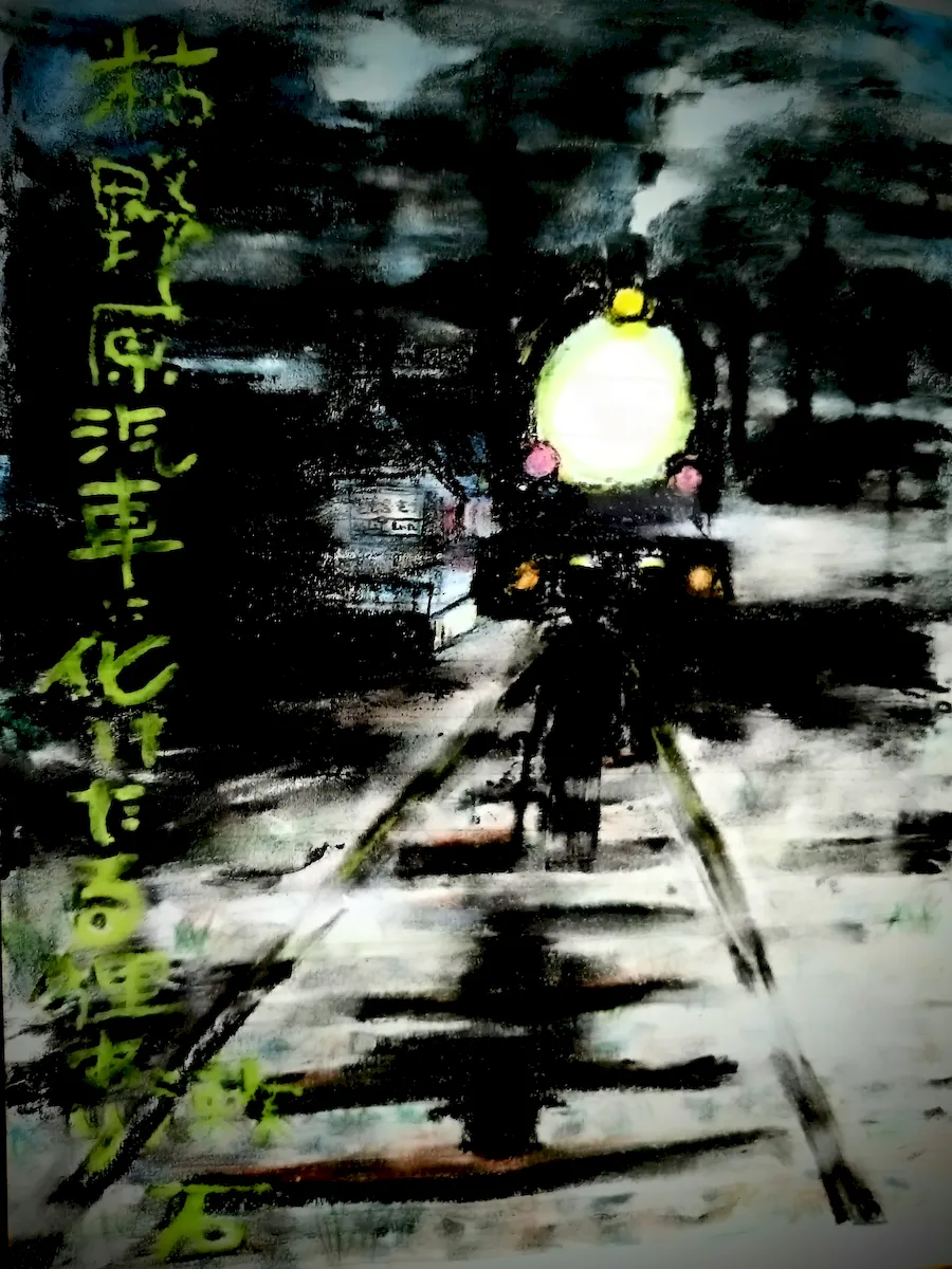 句は、松山にいた夏目漱石が正岡子規に送った一句。丁度、漱石が来松した明治29年に、一番町―小町間で伊予鉄道が開通。おそらく汽車に化けたんは、東雲神社辺りに棲む毘沙門狸ぞな。