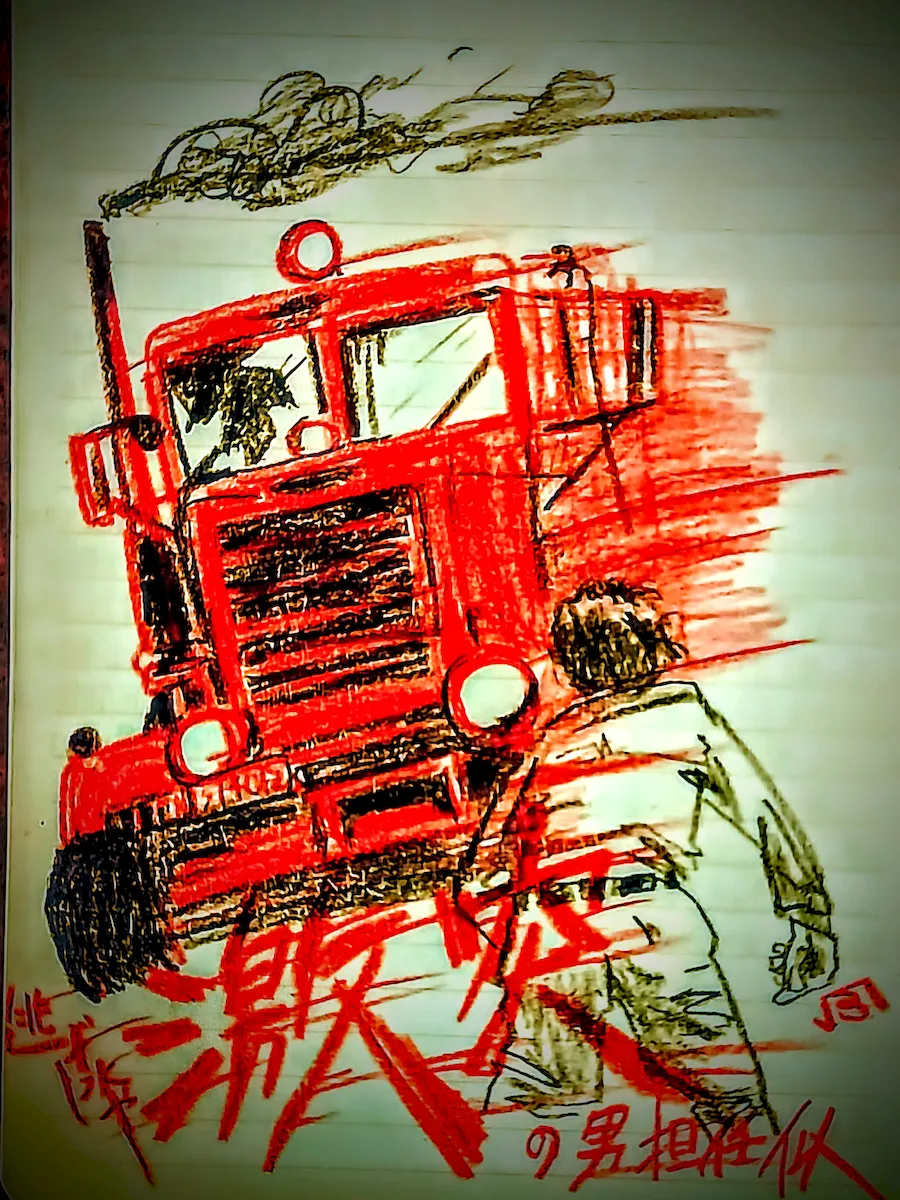 さて、描いたのは、スティーヴン・スピルバーグの若き日のテレビ映画『激突!』。追い抜いた1台のタンクローリーに執拗に追いかけられるという、シンプルなストーリーだが、手に汗握って何度も見た。『日曜洋画劇場』で、淀川長治が「あの車が、だんだん人の顔みたいに見えてくる。コワイ、コワイ!」なんて言っていた。主人公のメガネ・赤鼻のおっさんが、当時の小学校の担任の先生に似ていたのを思い出して、句にしてみた。ちなみに、我が母校は正岡子規も通った〈番町小学校〉。メガネの担任は、その後校長になったらしい。