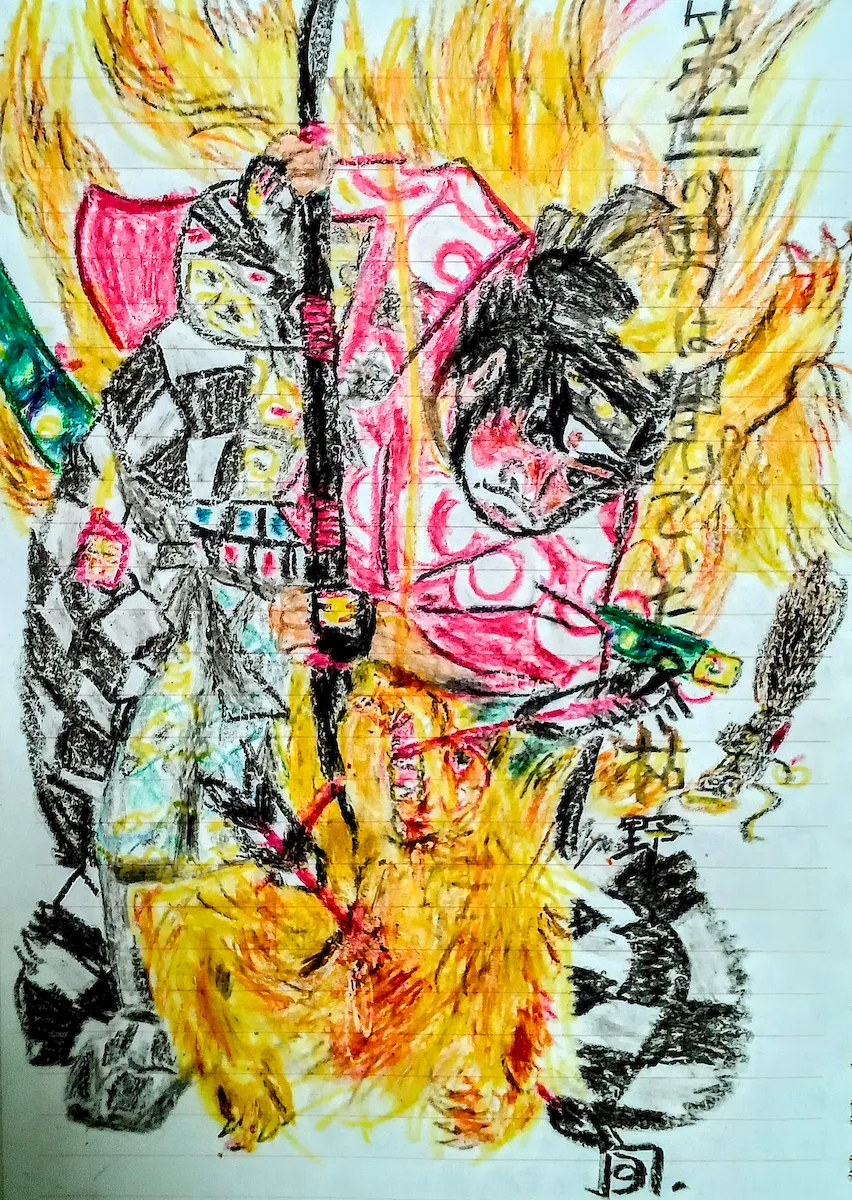 ただ、今回の主役は句にも詠んでいるように、右端にいる妖怪、古空穂(ふるうつぼ)である。元は、『百鬼夜行絵巻』にある空穂(矢の入れ物)の付喪神。更に鳥山石燕が『百器徒然袋』にも描いた。そこには、『九尾の狐を退治した三浦の介の古空穂が…』といった適当な解説が…。