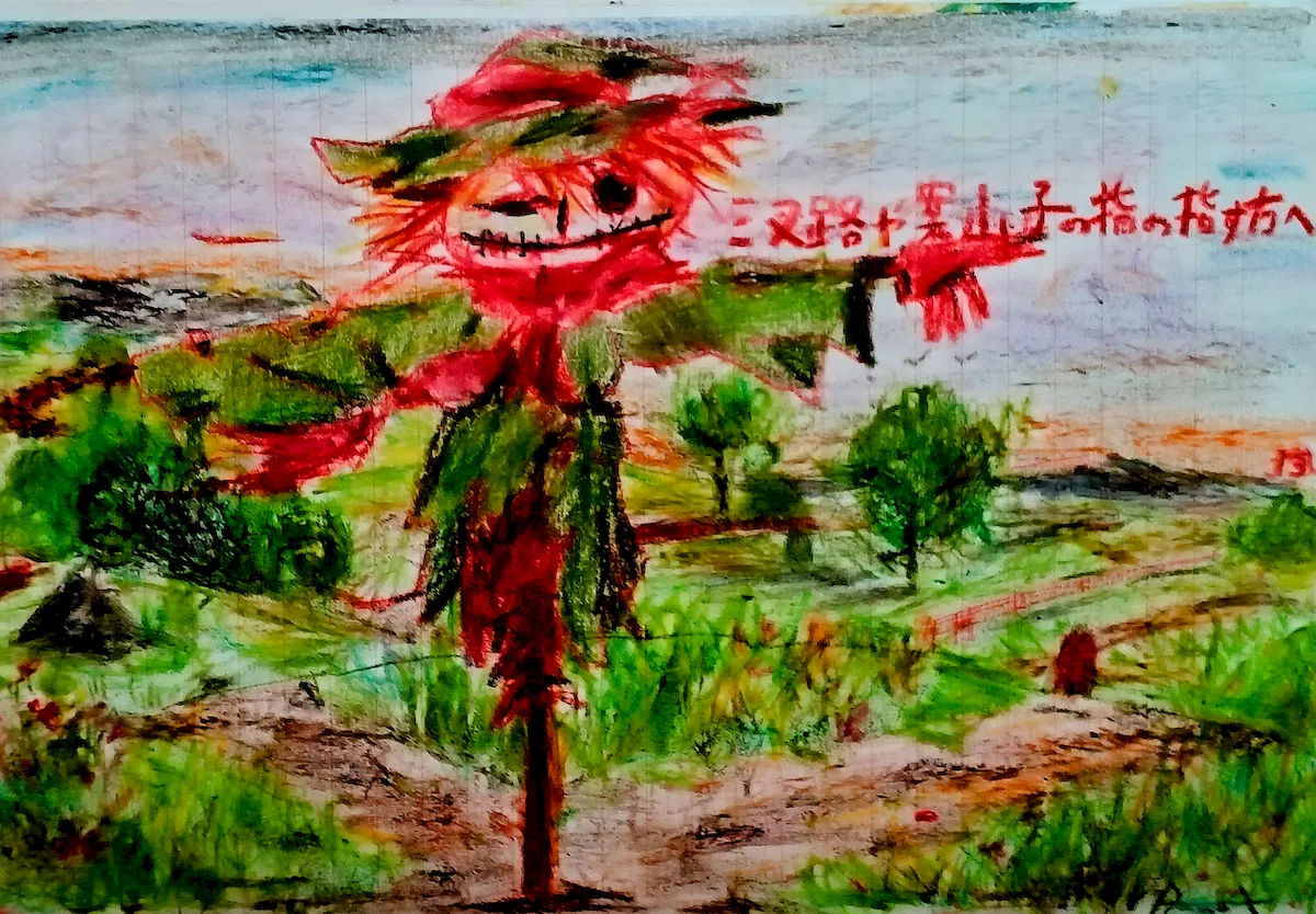 絵に描いた、〈案山子〉も田の神の依代とも考えられた。害虫除けとして、獣の焼き焦げた匂いを嗅がせるというのが語源。『古事記』一日中世の中を見ている知恵者、久延毘古(クエビコ)として登場。大国主命に、少彦名命の名前を教える。そこには「山田のそほど」という、案山子の古語で載る。長野では、旧暦の10月10日に案山子を祀る行事〈カカシアゲ〉やが行われ、諏訪では案山子が天に、安曇では山に帰る日とする。柳田國男は、『初めて鳥獣の縅しのこの人形をたてた人の心持は、これが自分達の姿のように見えて、相手を誤解させようというのではなかった。形はどうあろうともこれが霊であって、むしろ人間以上の力で夜昼の守護をするものと信じられていた。』と、『年中行事覚書』で述べている。