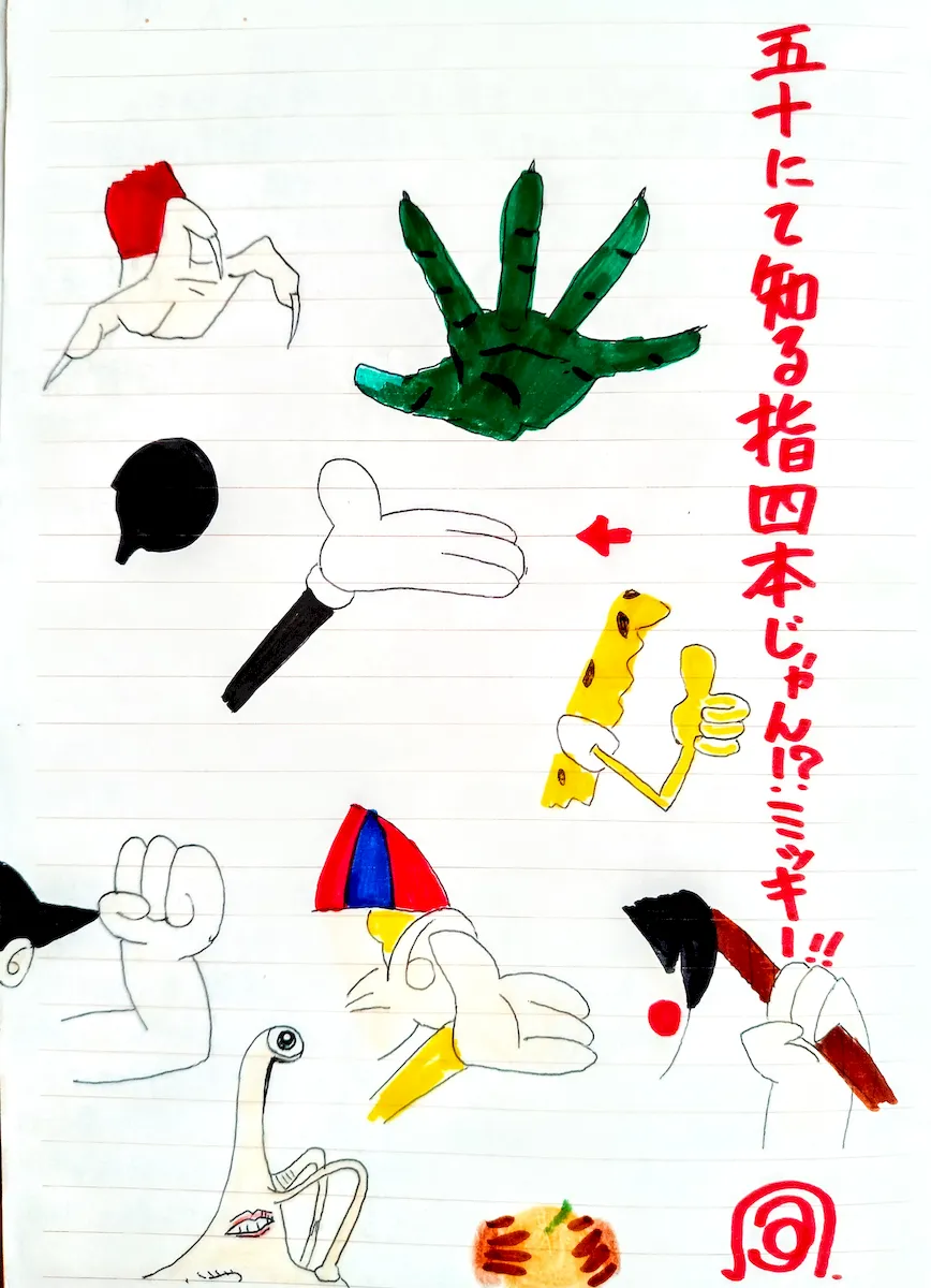 先日、ミッキーマウスを描いていて、ふと気付いた…指、4本?! 調べてみると、ウォルト・ディズニーが、この方が描きやすかったから…らしい。確かに、あの太い指を5本描くとアレだが、だからって1本消しちゃうとは…! それを見習って、絵にも描いたが、日本のアニメでも、アトム・ハイジ・怪物くん…日本じゃないけど、ロシアのチェブラーシカも4本指だった…!! しかし、実は現在の日本では、例え4本指に描かれた海外のキャラクターでも、5本に修正されている。理由は、差別的だから…。なんと、あの『ドラゴンボール』のナメック星人ピッコロも、アニメでは5本指に! 初めて『少年ジャンプ』で指の数見たとき、凄いと思ったのにな〜…。ただ、スポンジ・ボブは良いらしい…。スポンジだからか?