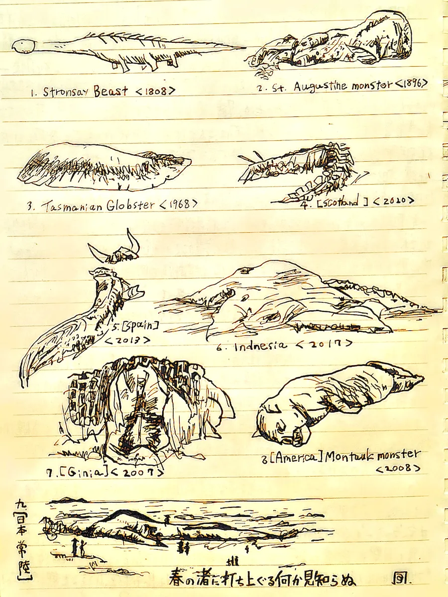 1808年スコットランド・ストロンゼー島に、巨大な生物の死骸らしきものが打ち上げられた。長さ16.8m、3対の肢らしきもの、小さな頭と目、滑らかな皮膚、銀色の鬣。エディンバラの〈ウェルネリアン自然史協会〉が解剖したが、正体は不明とされた。
