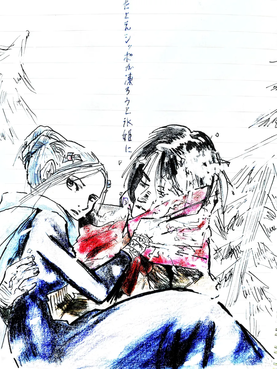 さて、絵に描いたのは氷姫。モデルは、沙村広明『春風のスネグラチカ』(スネグラチカは雪娘だが)。トーベ・ヤンソンの『ムーミン谷の冬』の氷姫は、見る者すべてを凍らせてしまう。句は、彼女を見て凍ってしまったリスの話から。一方、ハンス・アンデルセンにも『氷姫』がある。子供の頃に氷河に落ちた男が氷姫に目をつけられ、大人になり結婚式の日に、湖の中に連れ去られてしまうという恐ろしい話。元ネタは、スイス・レマン湖ベイルツ島の伝説。といえば、あのナルシスが、湖に映った自分に口づけしようとして溺れ死んだ? もしや、これも氷姫の仕業?