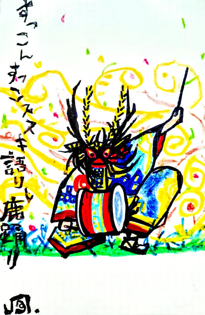 さて、描いたのは東北地方の〈鹿踊り(ししおどり)〉。伊達政宗の長男秀宗が初代藩主となった愛媛県宇和島にも〈八ツ鹿踊り〉がある。踊りの起源は、鎮魂の為の〈念仏踊り〉とも、鹿の供養の為とも言われる。盆・彼岸・雨乞い等で踊られ、『古事記』や『万葉集』に載る程歴史は古い。「しし」は元々「肉」の意。鹿は「か」と言った(「猪」は「ゐ」)事から。これと似た踊りは、メキシコ、アメリカ・アリゾナ州の〈ヤキ族〉、タイ・ミャンマーの〈シャン族〉、インド…等、世界中にある。