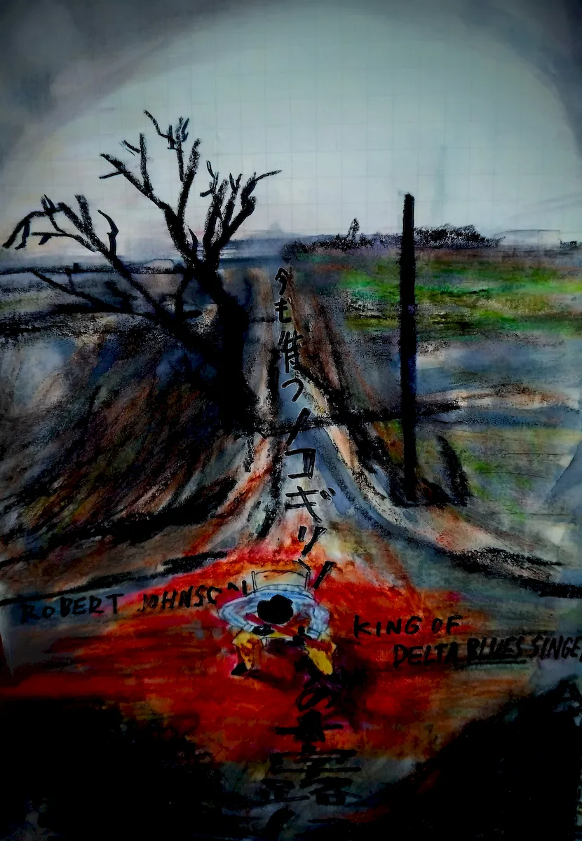 さて、最後にクロスロードの伝説をもう少し。そこへ、深夜0時ちょっと前に行き、一人でギターをひとくさり弾く。すると、黒い大男が現れて、ギターを取り上げチューニングをする。そうすると、何でも弾けるようになる…!