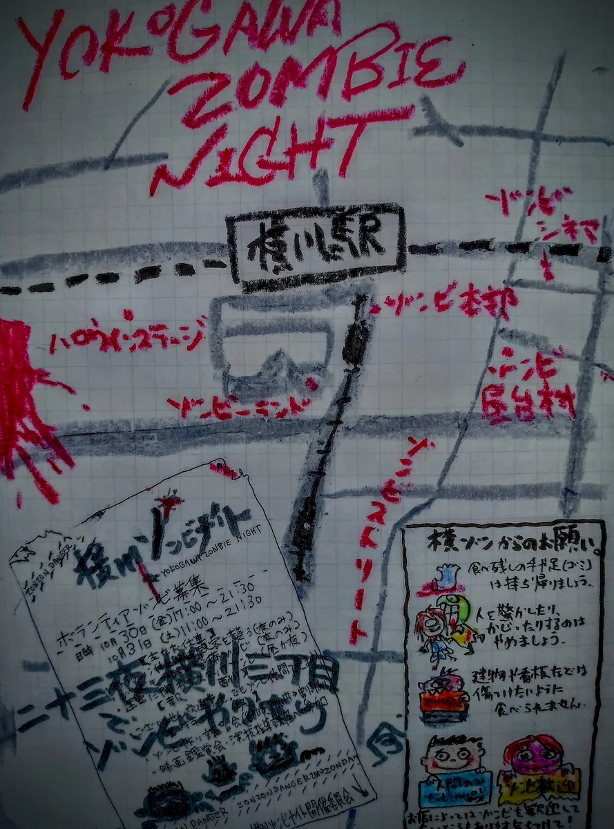 さて、絵に描いたのは、ゾンビの回でも紹介した、横川のハロウィンイベントゾンビナイトの実際のチラシだ。2015年にスタートしたんだから、早10年か! ゾンビだけにコロナも乗り越えたらしい。回を追うごとに、ゾンビ電車、ゾンビ飯、ゾンビソング、ゾンビ御朱印…と、パワーアップしていっている! あ〜いつか行ってみたいの〜!!