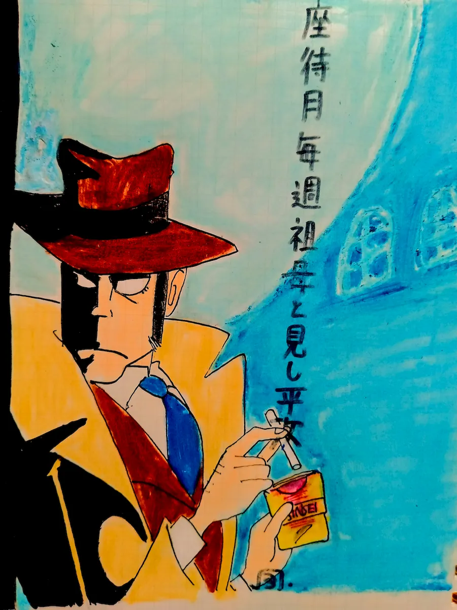 さて、最後になるが銭と来たら『銭形平次』! お〜と〜こだった〜ら〜一つにか〜け〜る〜♪ 野村胡堂原作、1966〜84年までテレビ時代劇として放映され、888回はギネス記録! オープニングのラストに映る、香川県観音寺の砂の上に描いた巨大〈寛永通宝〉を実際に見に行った時には感動したものだ。しかし、平次役が大川橋蔵から、風間杜夫にバトンタッチした時は全然ダメだ…と、子供心にさえ思った…。その平次親分の6代後の子孫が、絵に描いたご存知『ルパン三世』の銭形のとっつぁんこと、銭形幸一! 警視庁の警部だが、〈ICPO〉に出向中。柔道5段、タバコは〈しんせい〉、銃は〈コルトガバメント〉。好きな物はラーメン・演歌・『ダーティーハリー』!