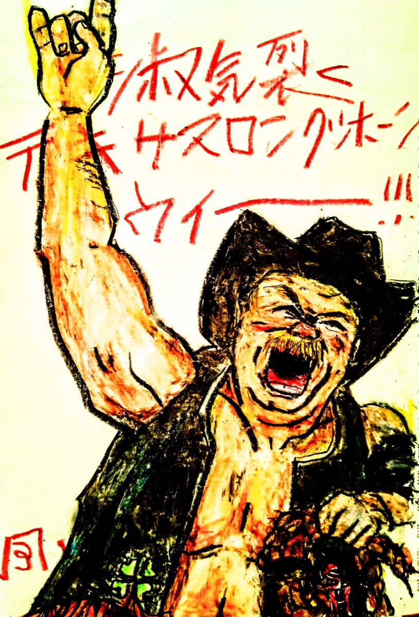 さて、絵に描いたのは、筆者が大ファンの往年のプロレスラー、スタン・ハンセン! 彼が掲げる手の形は、故郷テキサスの長い角を持つウシ〈テキサスロングホーン〉。決めゼリフの「ウィー!」は実は「Youth!」と言っていて、「若僧どもかかってこい!」という意味で発した。荒くれイメージのハンセンだが、実はとってもいい人で、現代はコロラドで余生を送っている。